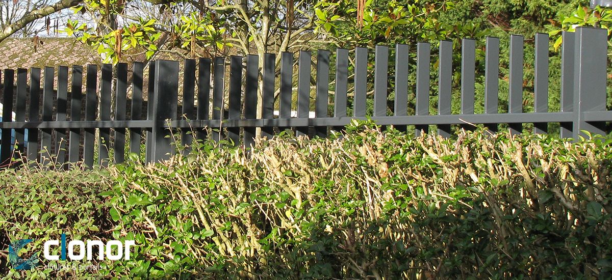 Les grilles NV10 CLONOR offre un design rectiligne. Elles sont assemblées par soudage et reçoivent des barreaux rectangulaires alignés de sur un coté des lisses. Les barreaux interpénètrent dans les lisses.