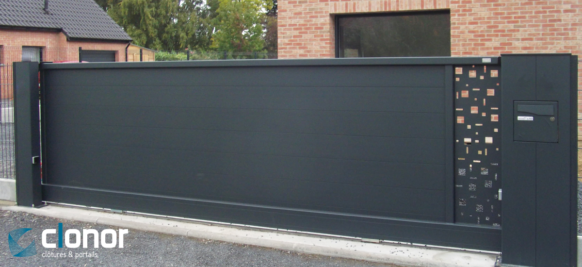 Ce portail CLONOR au design moderne reçoit un bandeau tôle E vertical avec des formes géométriques rectangulaire